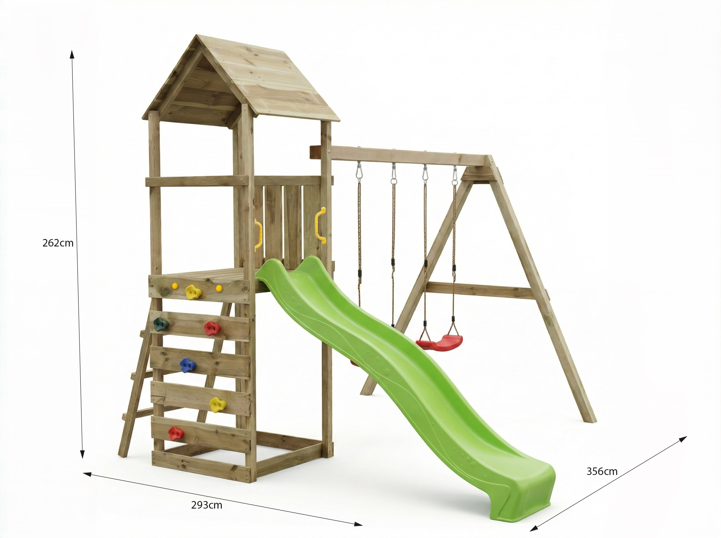 Centralnym elementem konstrukcji jest drewniana wieża z platformą i dachem, która stanowi doskonały punkt obserwacyjny oraz start do zjazdu. Na platformę prowadzi stabilna drewniana drabinka oraz ścianka wspinaczkowa z kolorowymi skałkami, wspierająca rozwój sprawności ruchowej i koordynacji.