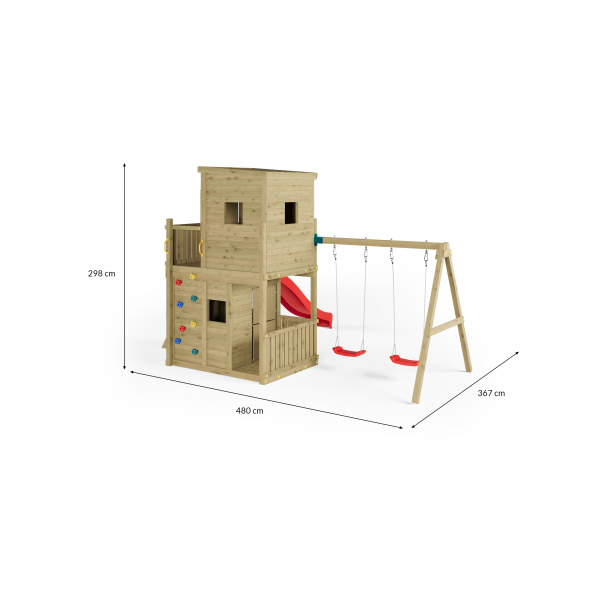 Podwójna huśtawka z czerwonymi siedziskami zapewnia mnóstwo radości, a stabilna konstrukcja i metalowe łączniki gwarantują bezpieczeństwo użytkowania. Ścianka wspinaczkowa z ośmioma kolorowymi kamieniami pozwala dzieciom rozwijać koordynację ruchową i siłę, zachęcając do aktywności fizycznej. W zestawie znajdują się także drewniane schody, które ułatwiają dostęp do wyższych poziomów konstrukcji.