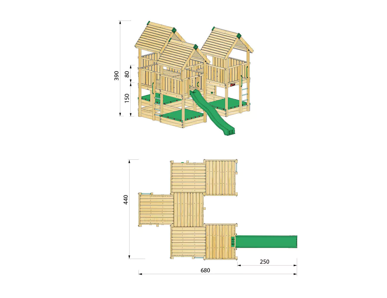 Plac zabaw Project VIII zestaw HY LAND jest największym z oferowanych zestawów tej marki. Bardzo duża powierzchnia do zabawy na platformach jak i pod nimi sprawia, że polecamy plac do miejskich parków czy dużych ogrodów dla większej ilości dzieci. Trzy wieże z daszkami połączono ze sobą łącznikiem bez dachu tworząc miejsce do zabawy na słoneczne, ale i pochmurne dni . Na platformy prowadzą drabinki oraz ścianki wspinaczkowe, zjeżdżalnia o długości 3 metrów umieszczono w jednej z zadaszonych wież. W wejściach na plac zabaw i przy zjeżdżalni są zamontowane uchwyty o bezpiecznej szorstkiej antypoślizgowej fakturze. Konstrukcja placu zabaw Project VIII to solidne kantówki z drewna sosnowego zabezpieczone impregnatem.