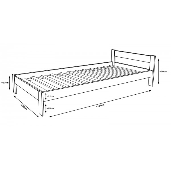Wymiary łóżka: 195x100 cm, wysokość: około 50 cm.